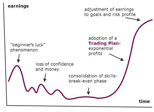 The graph below shows a typical equity curve during a currency trader’s first decade, and 80% of traders are quite at the edge of losing Confidence and Money.